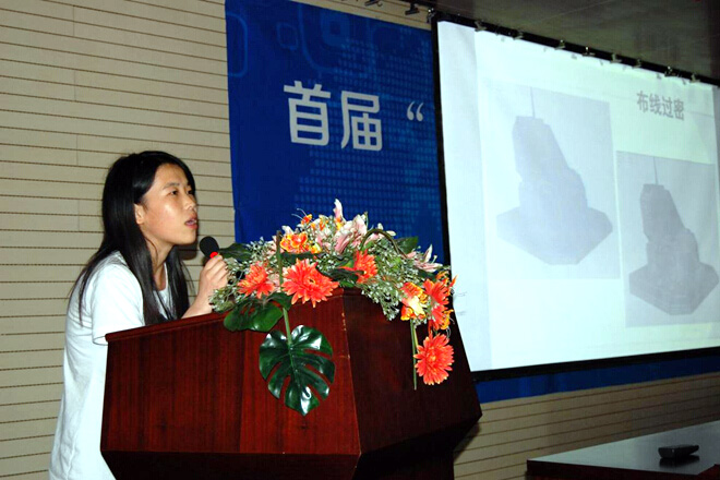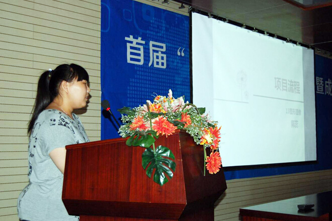 图为:河北工业职业技术计算机技术系学生代表郭蕊进行《项目流程》实践总结报告